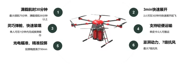 ● ZMD60无人机支持集群控制与5G联网,具备7级抗风能力,可执行物资运输、精准投弹等任务;