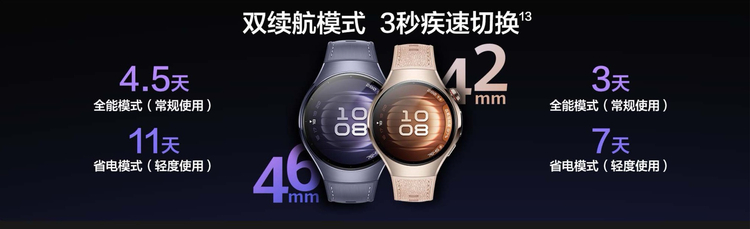 HUAWEI WATCH 5创新推出"全能模式+省电模式"双模式设计,3秒即可快速切换,完美平衡高性能与长续航需求。全能模式下,手表性能相较以往有效提升35%(数据来源于华为实验室,测试机型为搭载HarmonyOS 5.1 出厂版本的 HUAWEI WATCH 5,对比搭载 HarmonyOS 3 出厂版本的 HUAWEI WATCH 4,测试应用均为 2025年5月版本,具体以实际为准),支持指尖实时血氧、微体检、心血管健康等健康功能(本产品及基于研究所提供的健康数据、结果及建议仅供参考,不作为诊断和治疗依据),高尔夫、自由潜等100+运动功能以及手势操控等智慧功能,同时还支持eSIM独立通话、独立导航等旗舰功能,在全能模式下,HUAWEIWATCH5 42mm和HUAWEIWATCH5 46mm常规使用分别支持3天续航和4.5天续航。而在省电模式下,HUAWEIWATCH5依旧可提供基础健康监测及100+运动模式,其中HUAWEIWATCH5 42mm常规使用最长可达7天续航,而HUAWEIWATCH5 46mm最长可支持11天超长续航。无论是城市通勤中的移动支付、骑车导航场景,还是户外运动时的精准定位需求,HUAWEI WATCH 5凭借双模式设计带来的持久稳定性能,皆能轻松应对,以卓越表现重新书写智能穿戴设备的续航新标杆。