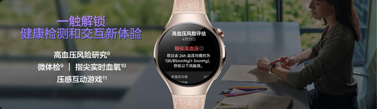 2024年,华为发布玄玑感知系统,依托强大的超感知模组和算法,广泛覆盖人体六大健康系统。此次HUAWEIWATCH5首发指尖实时血氧监测功能,10秒即可快速精准出值并支持实时刷新。在表盘界面状态下,用户轻触智感窗3秒即可开启微体检,仅需60秒即可获得涵盖17项健康数据和研究项目分析的微体验报告,同时HUAWEI WATCH 5还实现了免气囊高血压风险研究模式的创新探索,帮助潜在高风险人群进行日常血压管理,成为用户的随身健康管家,提供全面可靠的健康保障。