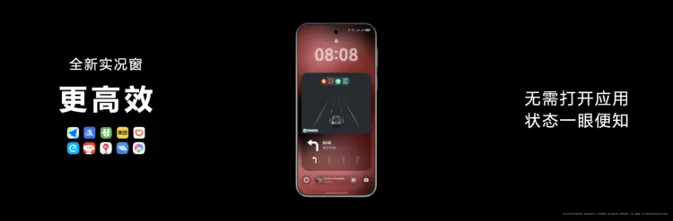 其中实况窗功能迎来全新升级:实况视觉与摄像头融合更好看,双边实况显示让信息呈现更丰富;支持更多三方体验,支付宝停车时长、跳时计费提醒,一键跳转支付宝缴费,还有航旅纵横、大麦等应用无需开启,状态实况一眼便知,体验更加高效便捷!