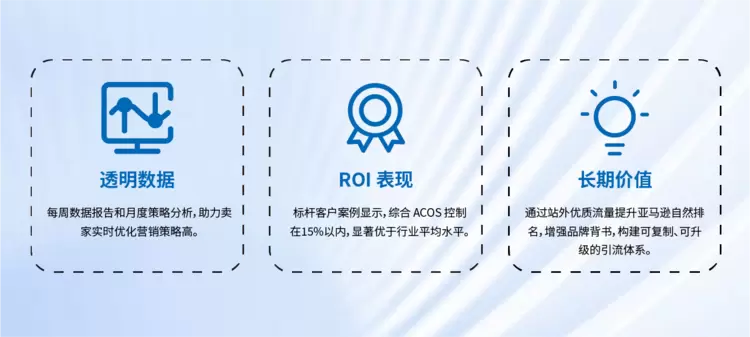 赛文思作为亚马逊卖家站外引流的先锋合作伙伴,凭借全球领先的联盟营销解决方案,助力卖家突破流量瓶颈,实现销量与品牌影响力的双重飞跃。结合深厚的行业资质、卓越的服务体系和数据驱动的运营优势,赛文思为亚马逊卖家提供一站式、高ROI的站外引流服务,通过站外引流和转化,帮助卖家实现亚马逊GMV增长第二曲线,案例实践显示3-4个月之后,逐渐可以达到整体GMV的10%左右。