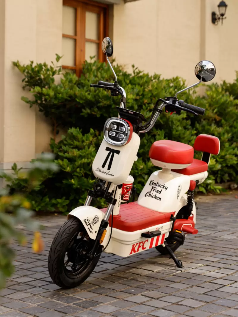 联名痛车的设计成为破圈关键。红白配色车身融合肯德基经典LOGO与台铃科技元素,复古造型搭配杯架、手机支架等实用配置,使其迅速成为街头“行走的广告牌”。当联名痛车驶入街头巷尾,它不仅是移动的交通工具,更化身“社交名片”。达人与年轻人在抖音、小红书掀起“晒车”狂潮,在#台铃肯德基联名电动车#话题下,打卡攻略、趣味段子持续刷屏,让痛车进化为全民共创的“态度符号”。